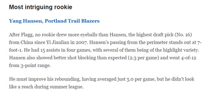 他的籃板球能力有待提升,場均僅5.0個,但在夏季聯賽中,他的表現并沒有讓人覺得開拓者隊選他是個失誤。