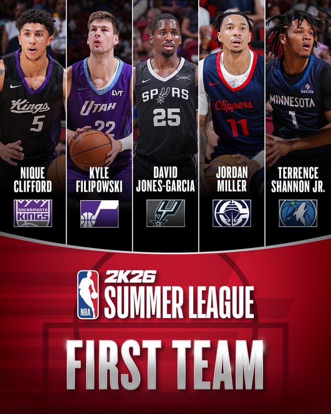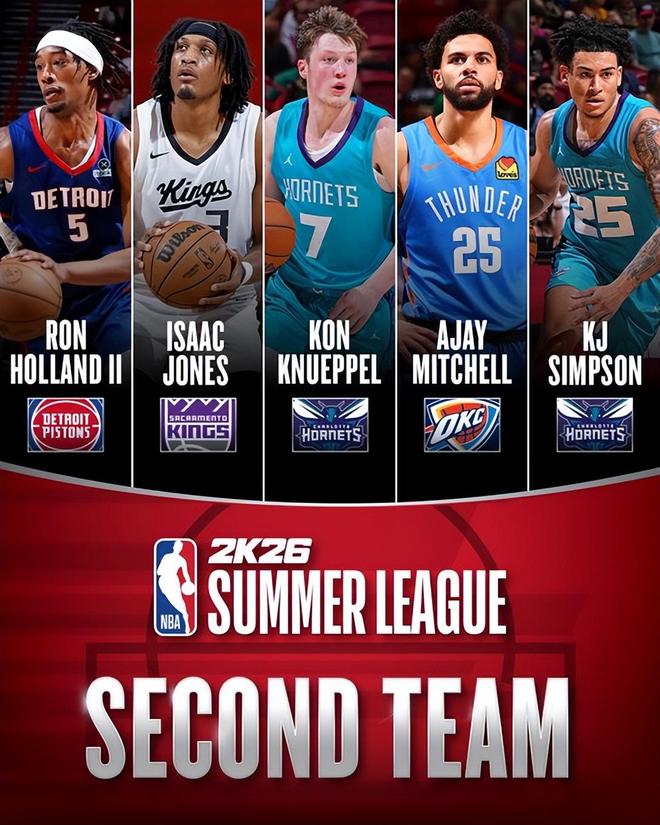 國王和黃蜂各有兩人入選最佳陣容。此前在夏聯(lián)決賽上,黃蜂83-78險勝國王,以6勝0負(fù)的戰(zhàn)績奪得夏聯(lián)冠軍,這也是黃蜂隊史上首次獲得夏聯(lián)冠軍,克努佩爾當(dāng)選FMVP。