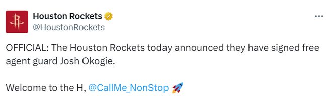 北京時間7月23日,火箭隊官方宣布,球隊已簽下自由球員后衛(wèi)喬什-奧科吉。據(jù)此前名記Shams報道,火箭和奧科吉簽下的是一份1年310萬美元的合同。