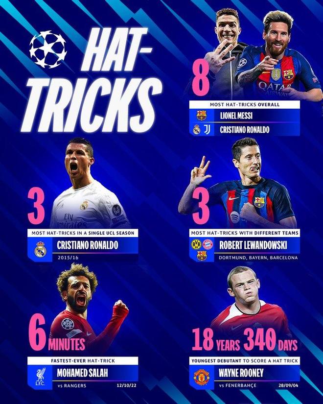 直播吧07月11日訊 歐冠官方發(fā)布了歐冠歷史上球員上演帽子戲法的各項紀錄。