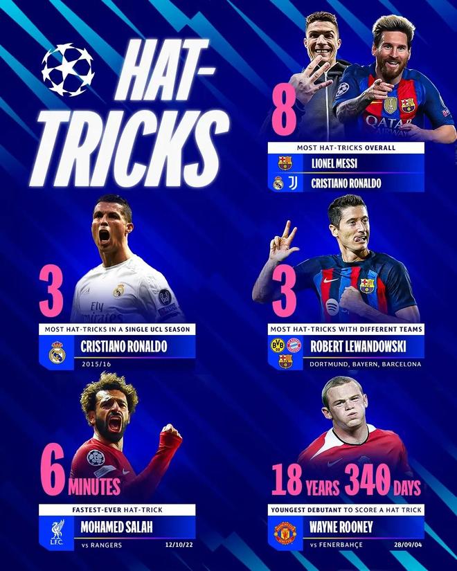 今日,歐冠官方賬號發布歐冠賽場有關帽子戲法的各項紀錄,C羅&梅西8次最多,魯尼18歲340天年齡最小。